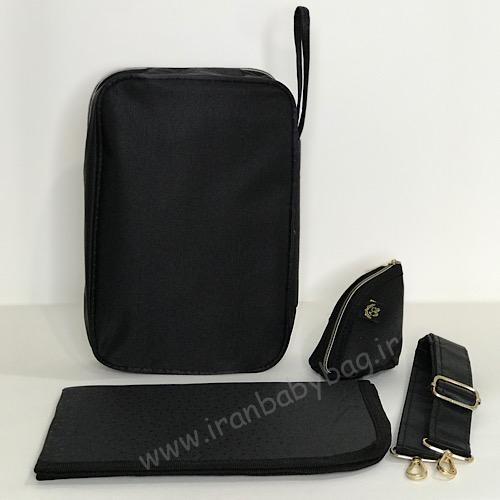 همراه با ساک لوازم مادر و نوزاد، یک عدد زیرانداز تعویض پوشک، کیف لوازم بهداشتی، محفظهی عایقبندی برای سرد یا گرم نگه داشتن شیشه شیر نوزاد، یک بند بلند برای استفاده به صورت رودوشی و کولهای و یک عدد کیف مخصوص پستونک قرار دارد.
