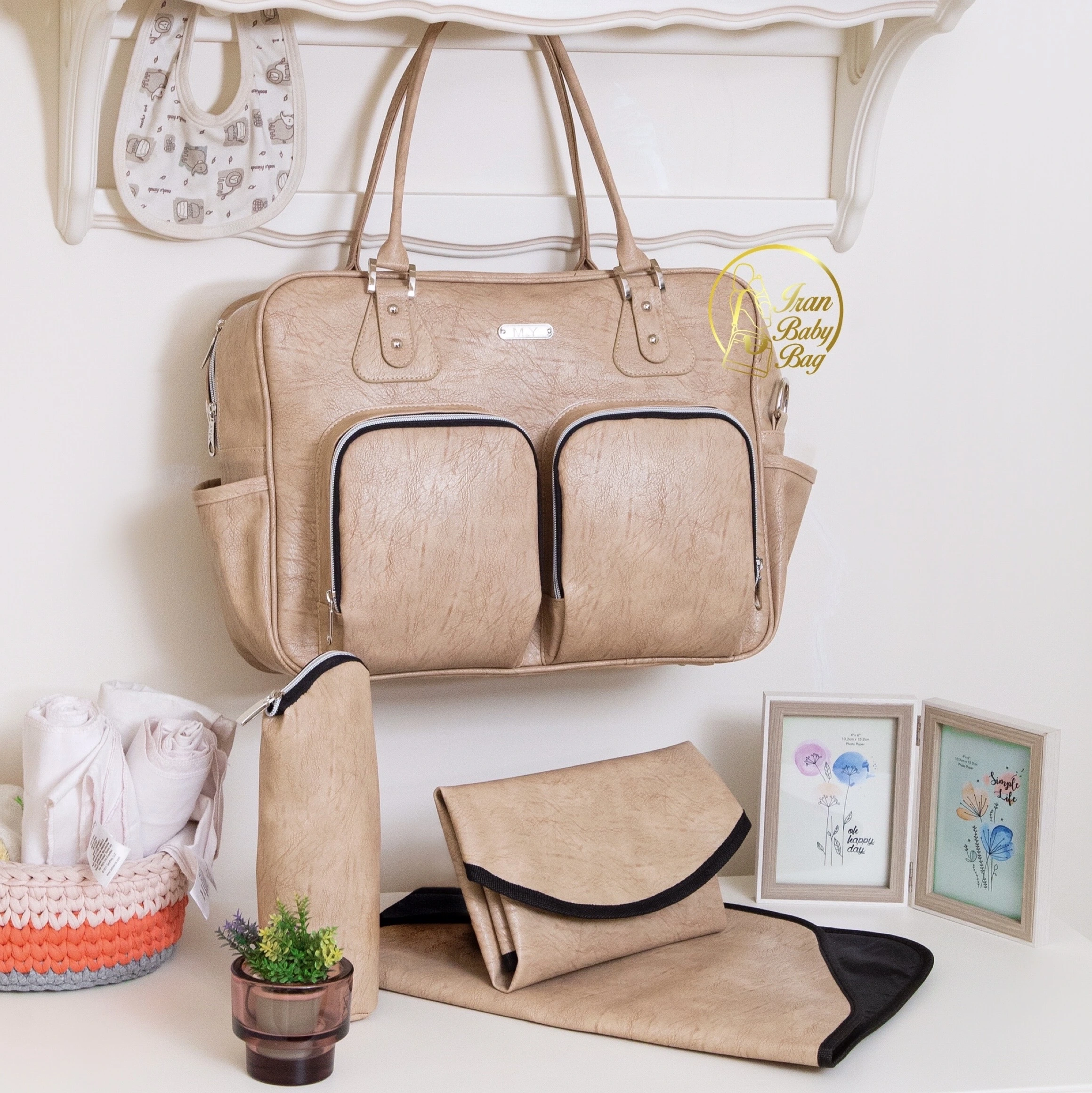 • ساک لوازم نوزاد مدل دو جیب برند ام اند وای عسلی
