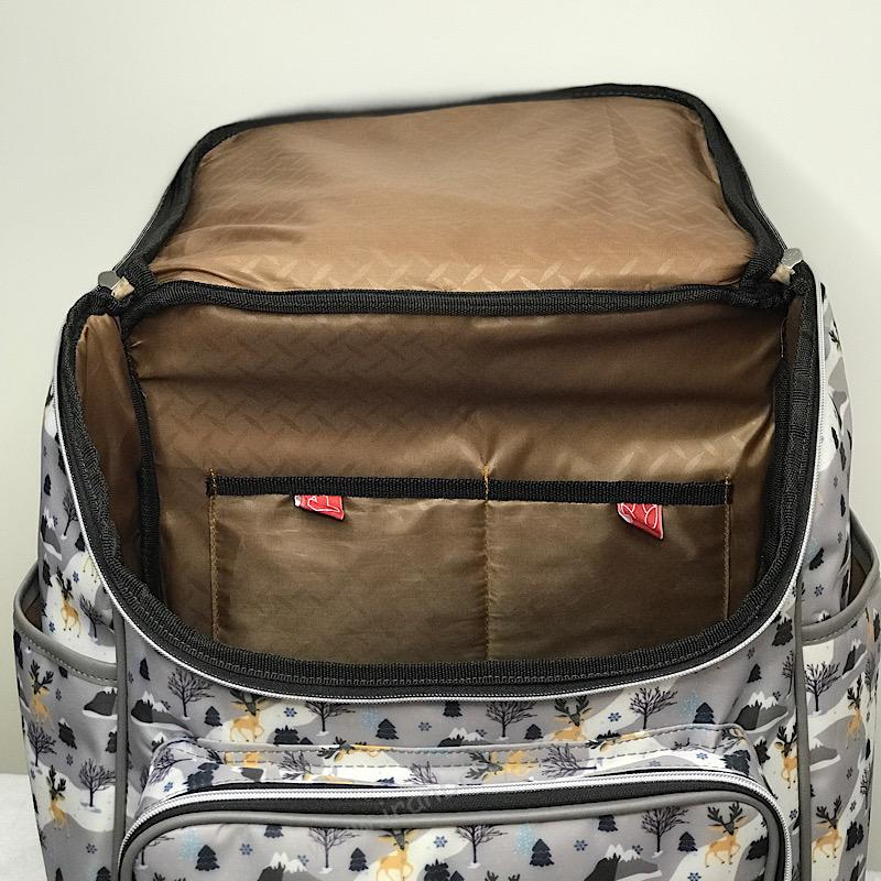 داخل این کوله پشتی دارای 4 جیب بزرگ برای ساماندهی بهتر وسایل است. بهعلاوه آستر سراسری داخلی به شستوشوی آسان آن کمک میکند. برای دسترسی بهتر به وسایل داخل کیف نوزاد، زیپ اصلی بزرگی در بالای کیف تعبیه شده است.