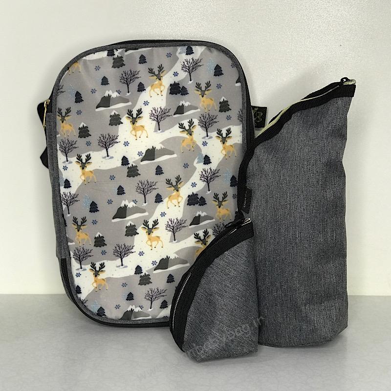 کیف لوازم بهداشتی همراه با کوله لوازم مادر و نوزاد از طرح پارچهی برزنتی کیف تولید شده است.